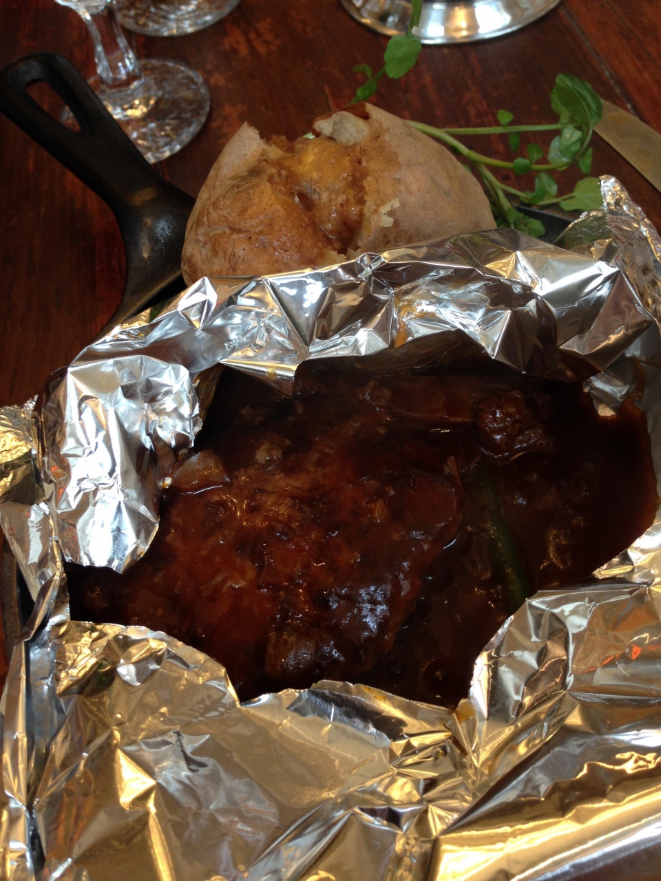 冷えた湯むきトマトが前菜、ホイルに包まれたハンブルグステーキ、丸ごとひとつのベイクドポテトとライス(パン)が、ランチセットになります。