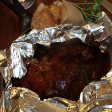 ハンブルグステーキとベイクドポテトは、とても熱いので、食べるときはやけどをしないように気をつけてください。