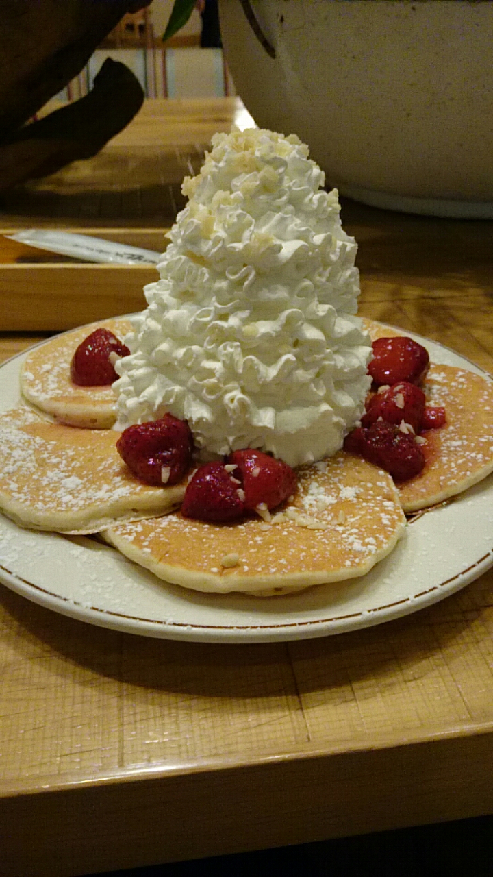 頼んだストロベリーのパンケーキは、たっぷりの生クリームのわりには甘すぎず美味しかったですが、普段甘いものをそれほど食べない自分には量が多く食べきれませんでした。