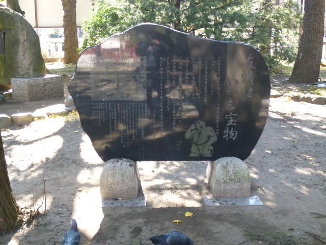 浅草寺にはたくさんの著名人の石碑や人物像などの記念碑が建っていますが、ここ浅草神社にも負けず劣らずさまざまな記念碑が建っています。その中に、友情はいつも宝物の碑、があります。これには物語があります。「浅草で幼いころ一緒に遊んだ同級生が偶然再会、二人は警察官と逃亡犯となっていました、そして再び熱い友情がよみがえり逃亡者は自首することになったのです」これは物語ですが人を思いやる気持ちの大切さや子供たちが健全に成長することの願いが込められています。2005年建立です。