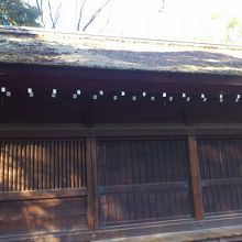 熱田神宮の本殿にお参りした後に、本殿の右側にある神楽殿に行きました。帰りは信長塀を見るために別の道で戻ろうとすると、左側にこの西楽所の建物がありました。桧皮葺が美しい建物です。将軍綱吉が再建した建物で、熱田神宮の中では古い建物だそうです。