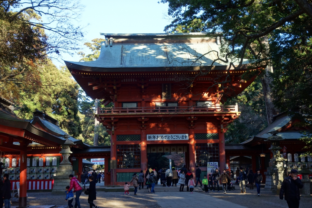 日本三楼門の一つに数えられる立派な赤い楼門を擁しており、
