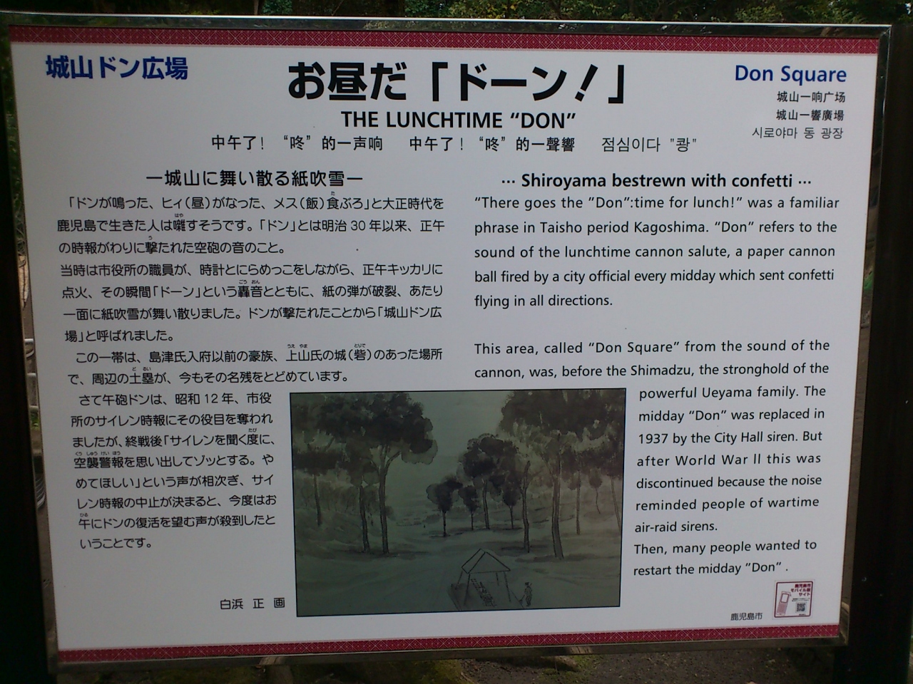 城山のバス停から展望所に向かう途中にあります。右に折れ曲がる角にある階段を登ります。何もない広場ですが、説明書きを読んで面白かったです。ドンとは昔、鹿児島ではお昼の合図に撃っていた空砲の音だそうで、それを合図にお昼になったそうです。