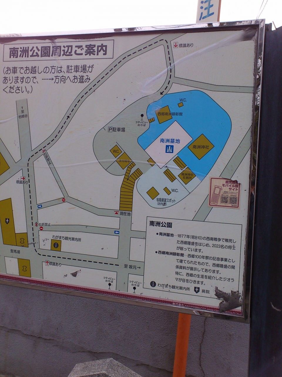カゴシマシティービューの南宗神社前というバス停で降ります。そこから少し歩くと南洲神社へ向かう参道の石段になります。石段を登り切ると南洲墓地に出ます。南洲神社や西郷南洲顕彰館など西郷隆盛に関係する施設や場所が集まっています。