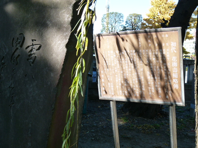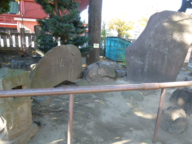 浅草寺にはたくさんの著名人の石碑や人物像などの記念碑が建っていますが、ここ浅草神社にも負けず劣らずさまざまな記念碑が建っています。鳥居を通ってその近くに集中して見ることができます。その中に、初代花柳寿輔の句碑を見ることができます。初代花柳寿輔(1821~1903年)は東京生まれの生粋の江戸っ子で、6歳で歌舞伎界に入門し8歳で初舞台に立っています。日本舞踊花柳流の初世家元であり江戸期から明治初期にかけて活躍し勧進帳や船弁慶などは有名です。歌舞伎界の中心的役割を果たしました。句碑「雷は田町をよけて鳴りわたる」は1969年建立です。参拝の節は是非立ち寄ってください。