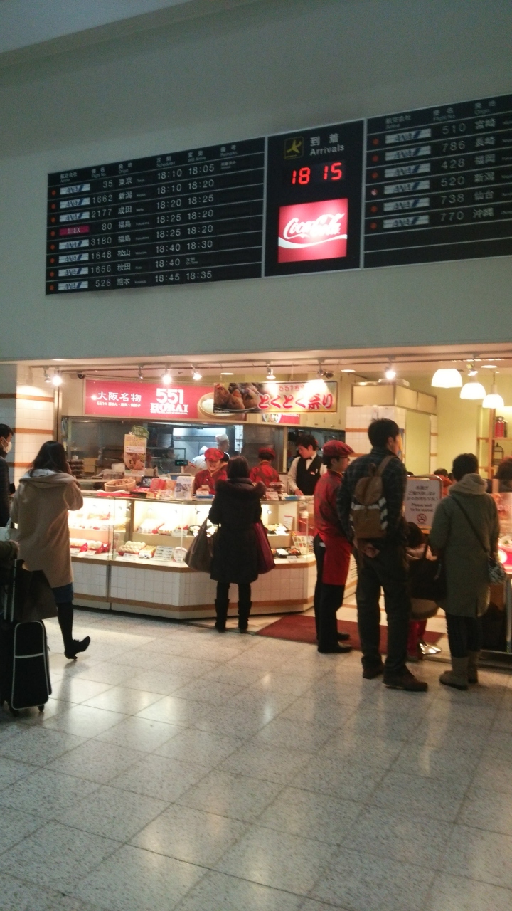 大阪空港anaで、到着ゲートをすぐでたところにある551蓬莱です。イートインスペースも有ります。温かいお土産を買えるのですが、人気があるのでかなり並んでいて買うまで時間がかかりました。家庭のおみやげにも豚まんはあいますね。