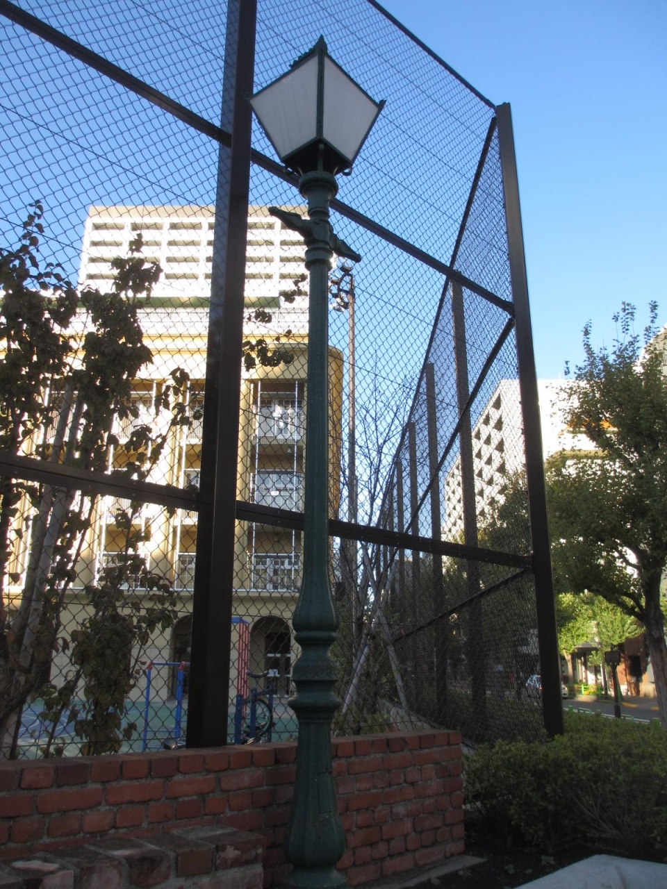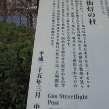 明石小学校の前に説明板とともにあります。柱は明治末年ごろのものと推定され、照明ランプ部分は、電気灯として利用されていたランプを修復して後年に取り付けたものだそうです。柱だけではなかなか昔のガス灯の姿を想像できませんでした。
