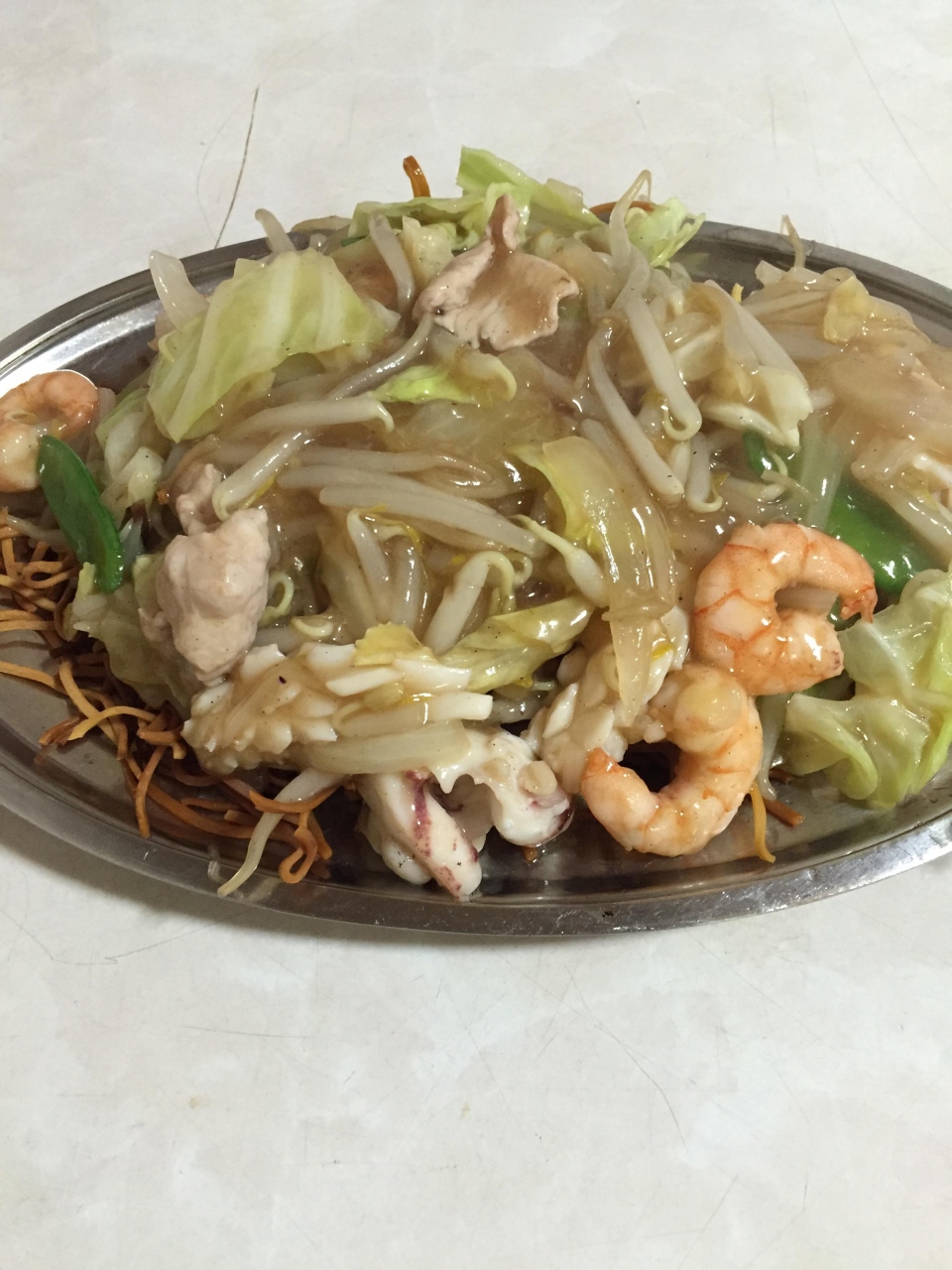 豚バラ丼としゅうまい、五目かたやきそばを食べましたが、サーブされるまでにはかなり時間がかかったのと、1品食べ終わる頃に次の品が出てくる感じだったので、シェアして食べたほうがいいと思います。