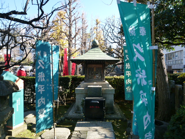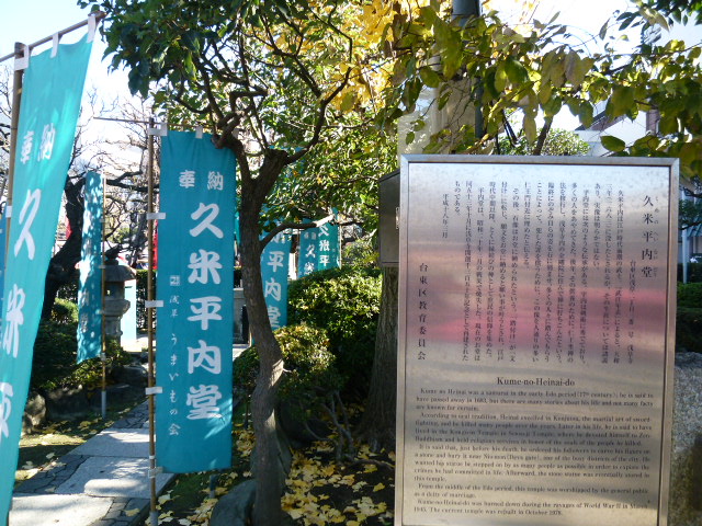日々多くの観光客でにぎわう浅草に都内最古の寺院で知られる「浅草寺」があります。国内外からの参拝客が多く参道は「雷門」から「仲見世」を進むと「宝蔵門」です。宝蔵門を入って右側にあるのが「久米平内堂」です。境内にはたくさんの碑や名所が残されていて、ここはあまり立ち寄る人が少ないです。この石造りのお堂には江戸時代前期の剣術家・武士の久米平内(くめのへいない)をお祀りしています。久米平内にとって浅草でらは深い縁があるようです。お見逃しなく