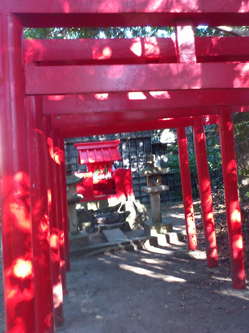 JR鳥羽駅で降りて夫婦岩へ向かうには、まずまっすぐに寂れた参道を歩いて行き、T字路で右に曲がります。そのあたりにこのお稲荷さんがあります。赤い旗があるので分かると思います。藪のような中を石段を進むと赤い鳥居が何個かあります。こんなところにお稲荷さんとびっくりします。