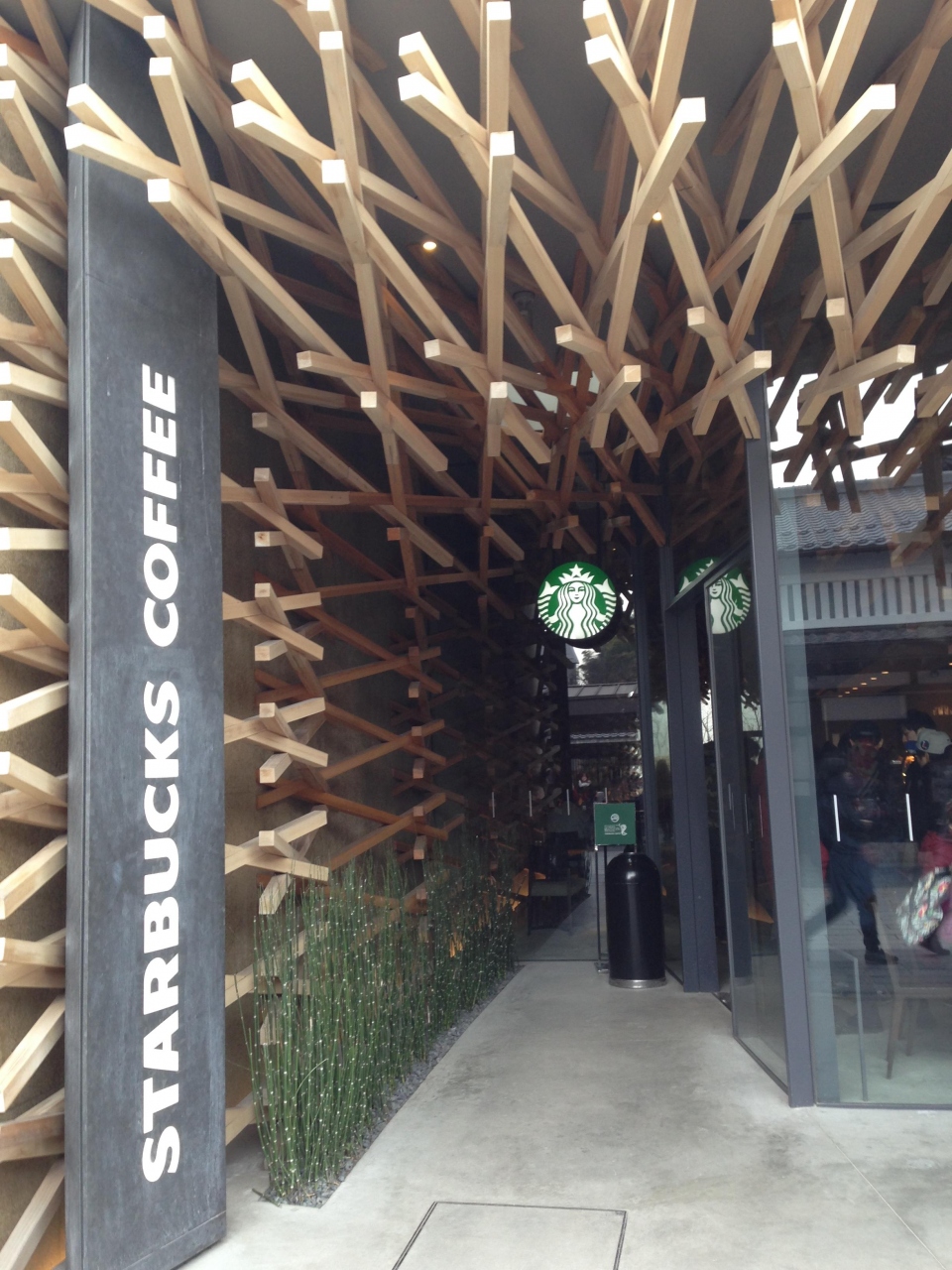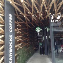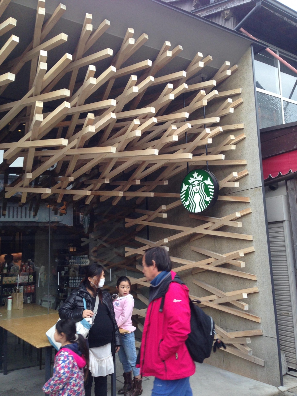 アメリカンスタイルのコーヒーチェーン店、店舗はは大体全国的に統一感があるコーヒー店だと持っていましたが、西鉄太宰府駅から太宰府天満宮へつながる参道に面して大変斬新なインパクトがある九州の美林を使ったデザインで地域性のある大宰府が表現されている店舗です。