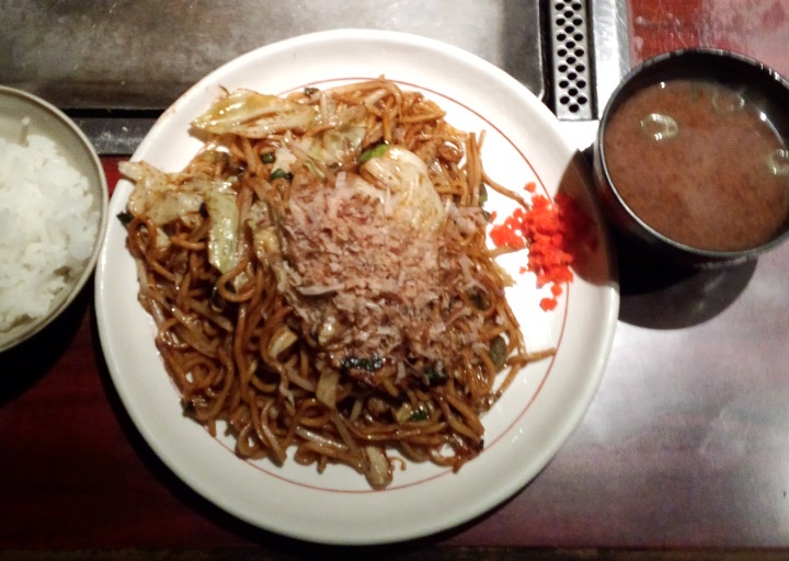 掘りごたつ式のテーブルに案内され、ミックス焼きそばに、白ご飯と味噌汁付きのごはんセットで800円でした。