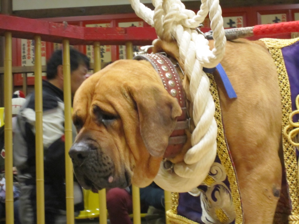 横綱土俵入りは、小さな土俵に横綱のまわしを付けた横綱土佐犬が登場し、間近で写真を撮ることができます。本当に登場して写真を撮るだけですが、迫力満点なのにかわいい姿に笑ってしまいます。その後は、土佐犬の子犬とふれあいタイム。係員のお姉さんが抱いている犬を触ったり、寝ている犬をなでなでします。みんな穏やかで全く吠えず、おとなしくてかわいいです。