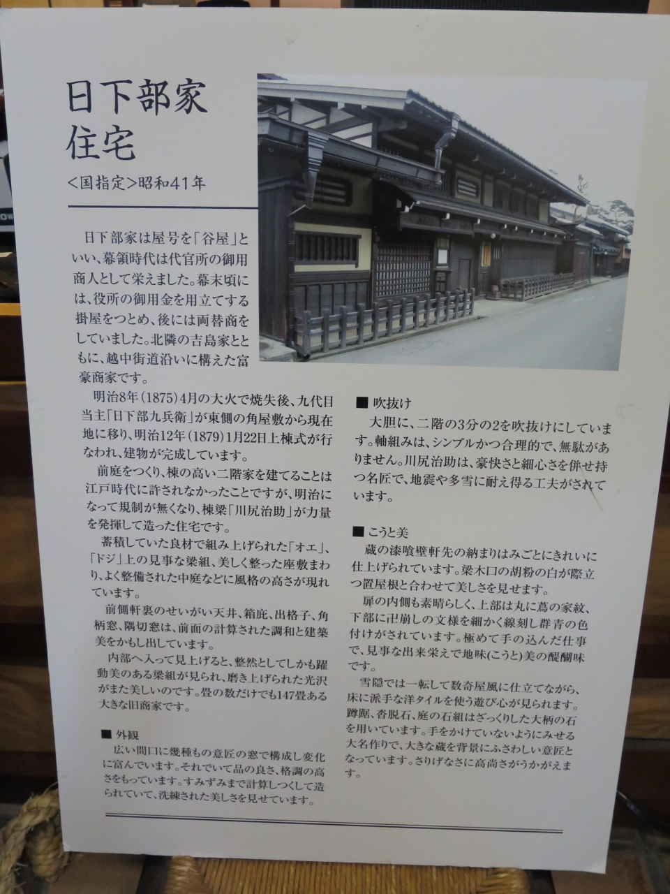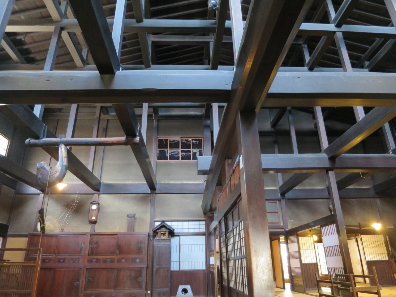 飛騨高山の櫻山八幡宮に近い大新町街並み保存地区にある高山を代表する豪商の町家建築で、重要文化財に指定されている建物で必見です。外見も立派ですが、中に入ると広い空間に黒光りする梁が印象的です。明かり窓のある天井までは10mもあるそうです。