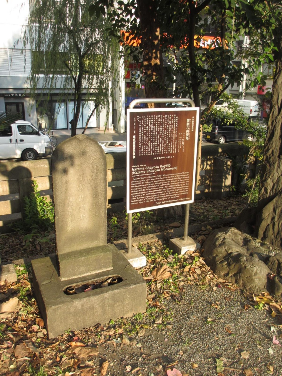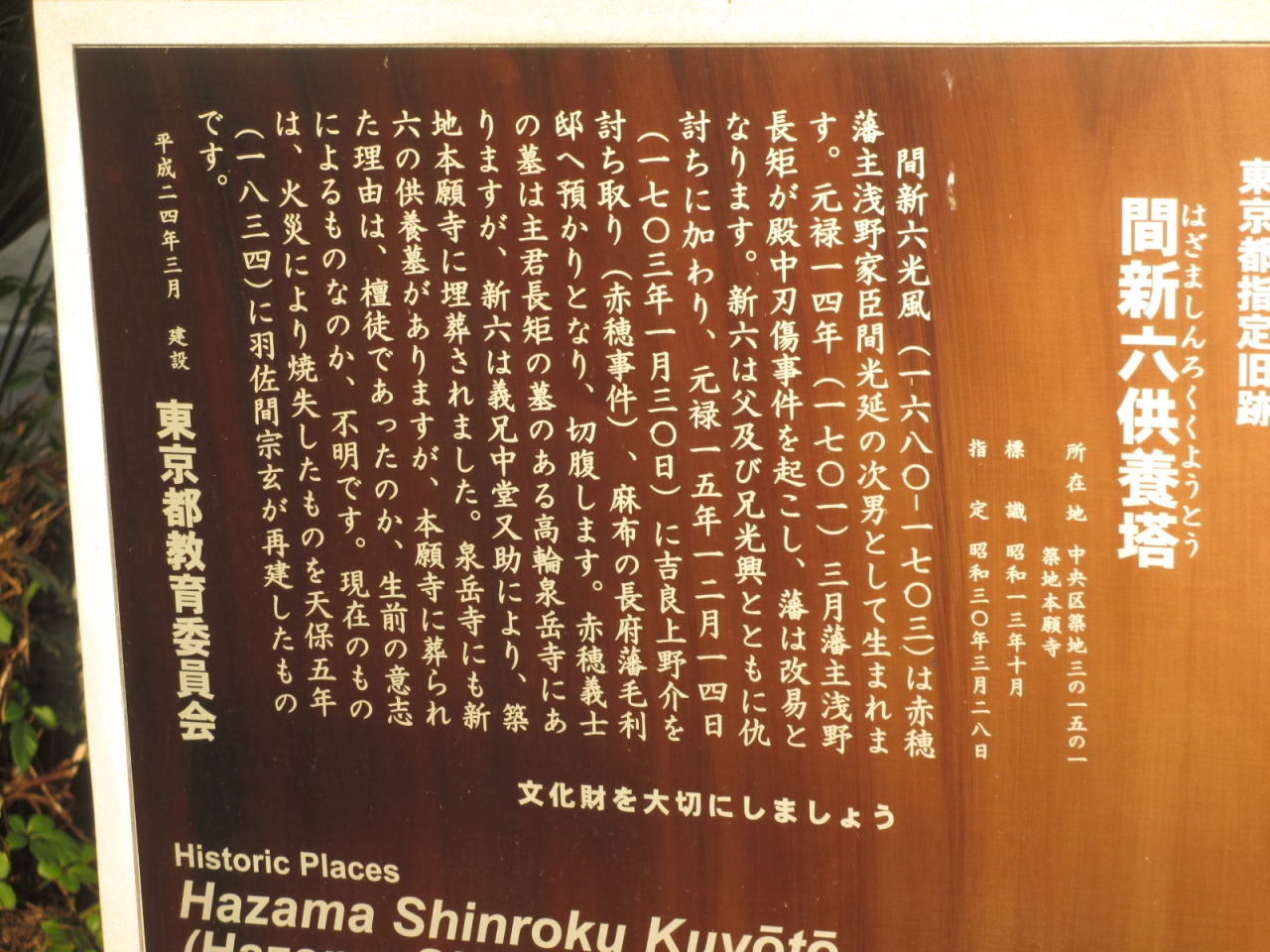 東京メトロ日比谷線築地駅1番出口を出るとすぐの場所、新大橋通り沿いにある浄土真宗本願寺派の築地本願寺の境内に入って左の突き当りまで進むと、碑や塔が並んでいる場所がありその中にあります。間新六は父・兄とともに吉良上野介を討ち取った人物ですが、なぜ築地本願寺に埋葬されたかは不明だそうです。