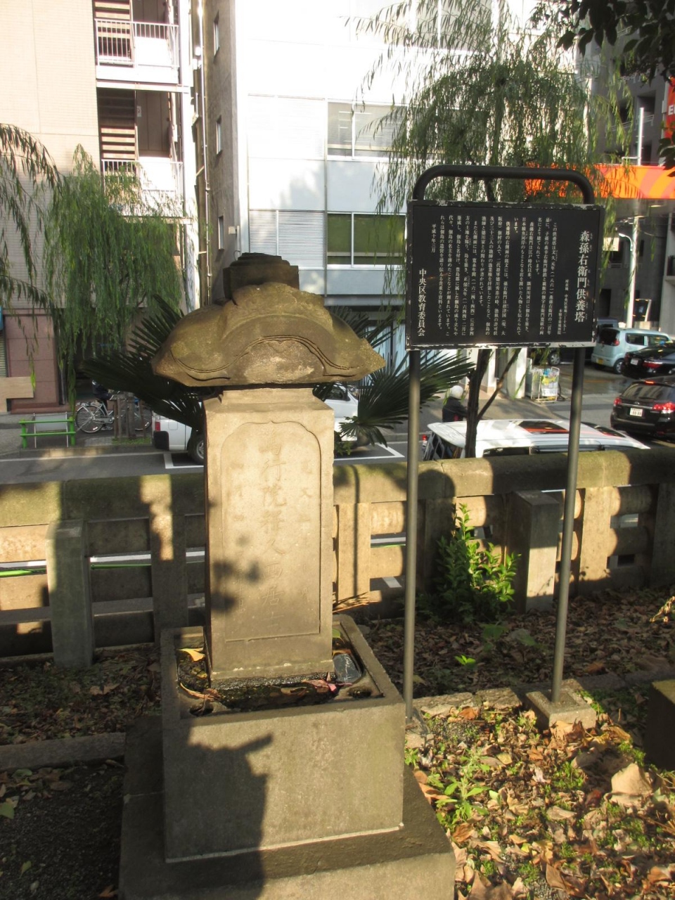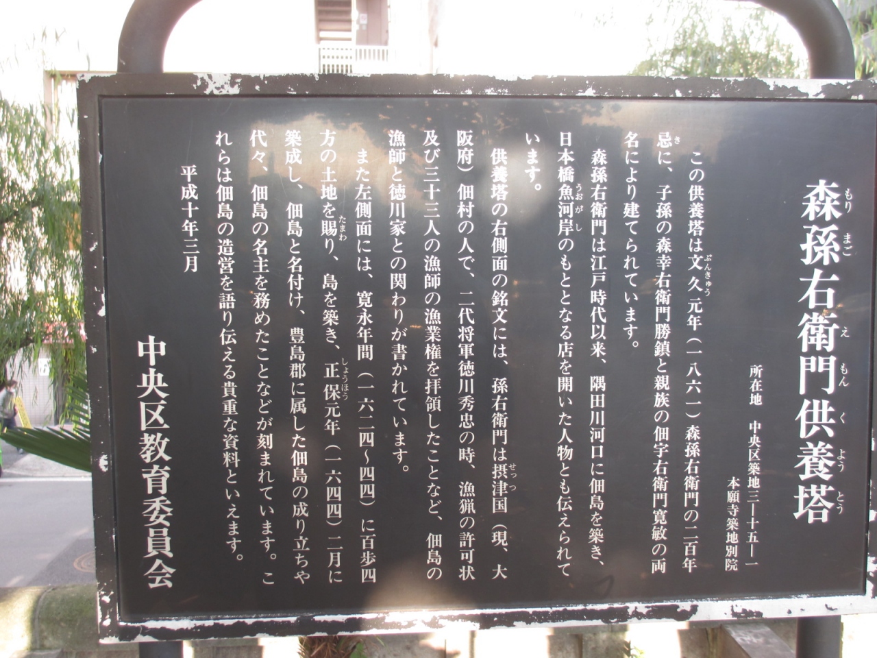 東京メトロ日比谷線築地駅1番出口を出るとすぐの場所、新大橋通り沿いにある浄土真宗本願寺派の寺院である築地本願寺の境内に入って左に突き当たるまで進むと、碑や塔が並んだ場所があります。こちらは、墓ではなくて“供養塔”です。森孫右衛門というお名前は存じ上げませんでしたが、説明板によると、佃島を築き、日本橋魚河岸のもとなる店を開いた人物だそうです。