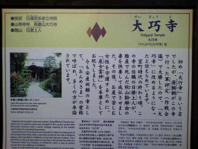 もとは大行寺という真言宗のお寺だったそう。源頼朝がこの寺で作戦会議を開き勝利、頼朝の命で大巧寺に改名。文永11年(1274年)に日蓮宗に改宗したそう。