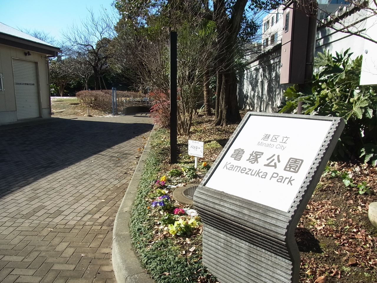 JR田町駅から徒歩20分くらいです。ちょうど聖坂を上り切ったあたりに亀塚公園がありその中に亀の甲羅のような小山があります。都会の真ん中にしては、昼間は近所の子供たちが大きな声を張り上げて遊んでいるのを見かけます。