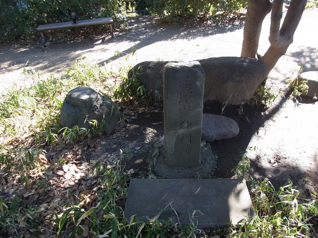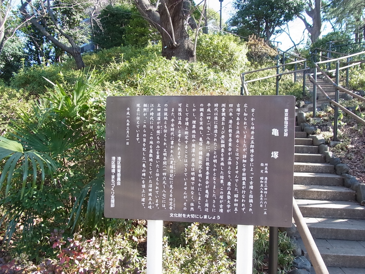 JR田町駅から徒歩20分くらいです。亀塚公園の中に亀の甲羅のような小山があります。埋葬施設や周濠が明確ではないため古墳と断定されておらず、1983(昭和58)年に都指定史跡となとなりました。山の上には2つほど石碑があります。