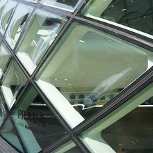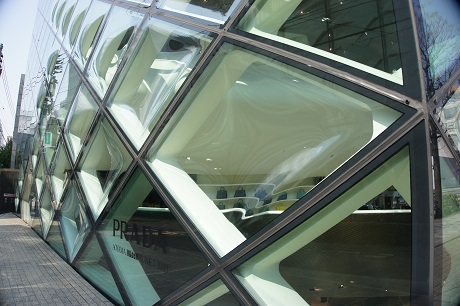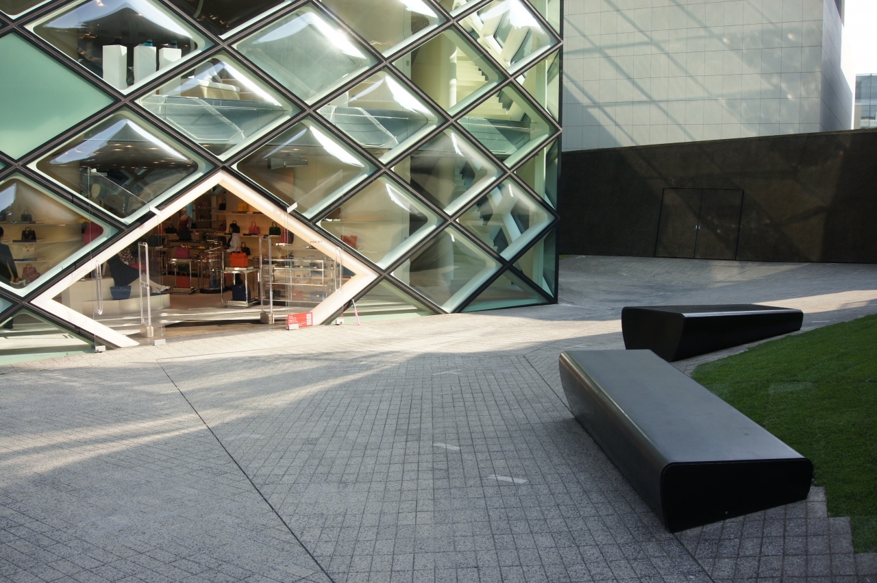 全面が菱形のひときわ目を引くガラス格子が印象的な外観です。様々な種類のガラスで構成されています。プラダらしい斬新でファッショナブルな姿勢を表した旗艦店です。デザインは北京オリンピック会場(鳥の巣)を手掛けたスイスの建築家ヘルツォーク&ド・ムーロンです。彼らにとって初のアジアでのプロジェクトです。