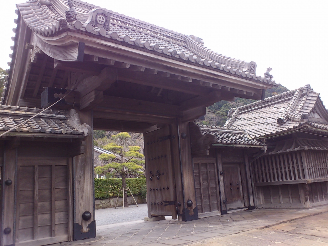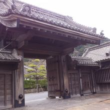 仙巌園の中に入って大きな鉄製アームストロング砲に驚いた跡、順路に沿って右に折れて歩いて行くと、右側にこの正門があります.NHK大河ドラマの篤姫で、江戸の薩摩藩邸として出てきたのは、この門だそうです。門をくぐって表側に回ると、鉄のワイヤーで補強されていました。