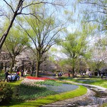 時期があえば、そこに植えたばかりのチューリップが咲き乱れ、水路に浮かぶ花筏、上空には新緑の若葉、まるでここは天国か?!と思わんばかりの美しさが広がります。