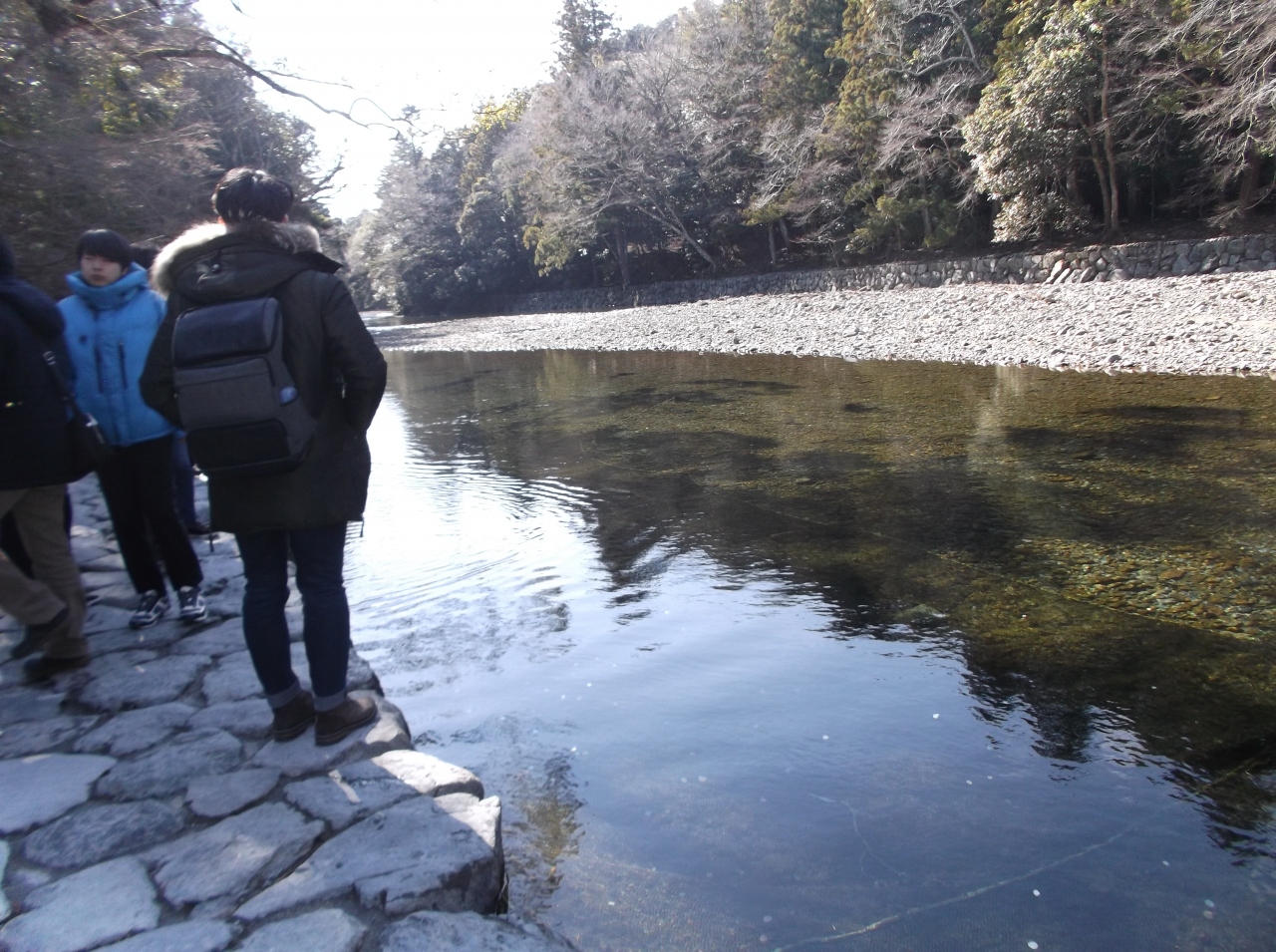 玉砂利を踏みしめて歩いて、五十鈴川で身を清めるのが、順路です。 まあ、手を洗うだけですが。