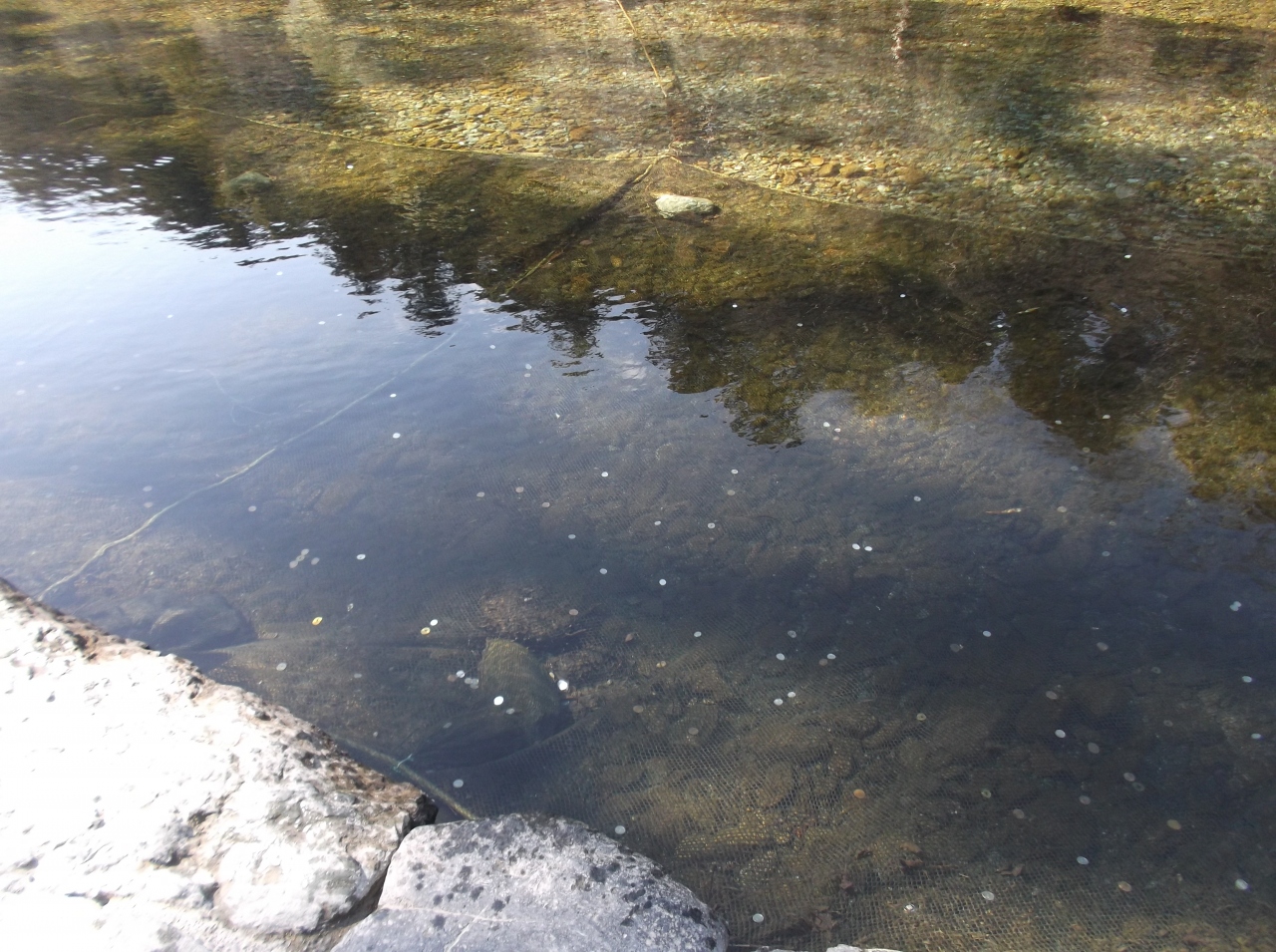 投げ銭禁止の立て札があり、それでもお金が投げられていて、川底には網が張られていました。