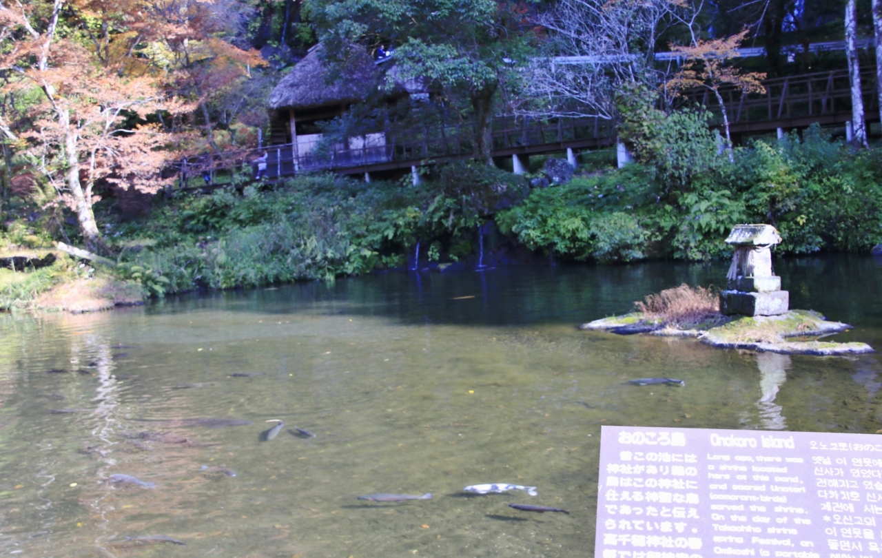 高千穂峡の遊歩道沿いにある池で周りは日本庭園風になっています。イザナギ、イザナミの命が最初に作ったのがおのころ池に浮かぶ「おのころ島」と言われているそうです。そんな国産みの神話のある池ですが、なぜかチョウザメが泳いでいます。いわれを知らないと見過ごしてしまうかも。。。