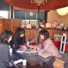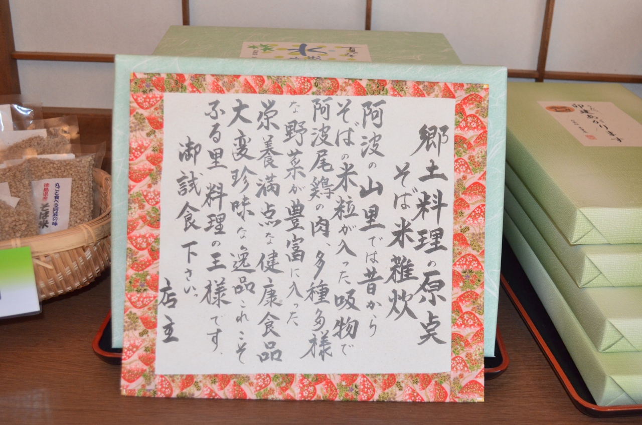 美馬市のウダツの町並みを見学後昼時になったので、国道線沿いの駐車場に車を止めて、案内板に素って進むと、丁度町並みに入る突き当たりに、暖簾が下がっていたので、飛び込みで入ってみた。女将も愛想よく町の説明をしてもらえた。ここの名物を聞くと「そば米ぞうすい」を薦められたので食することとなる。味はさっぱりしており蕎麦を旨く浸かった風味がよかった。
