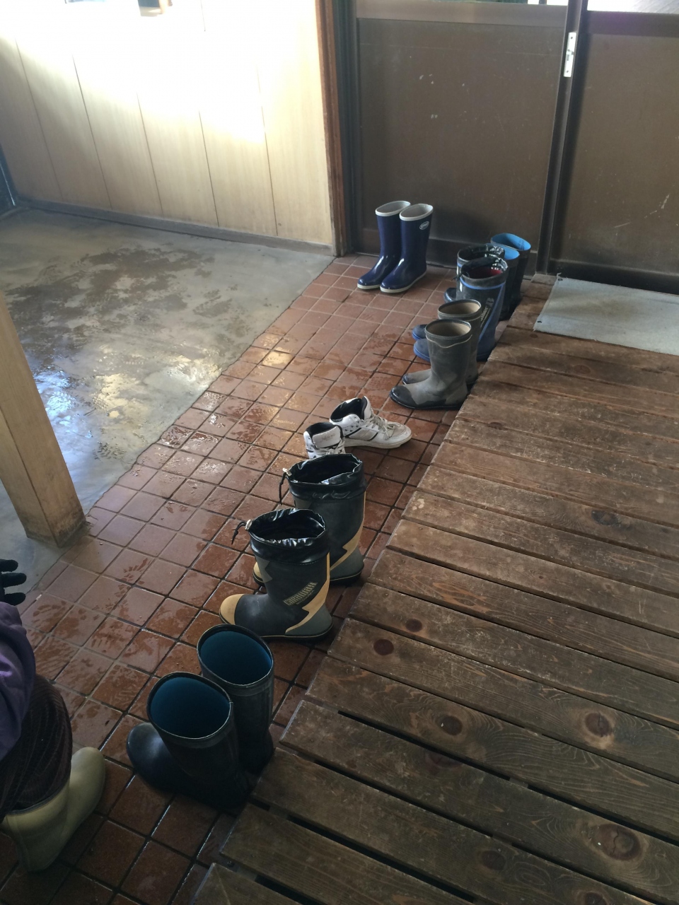 脱衣所の床には、服を入れた籠があちこちに