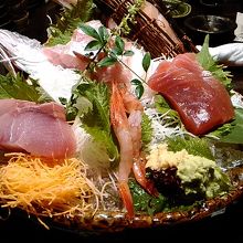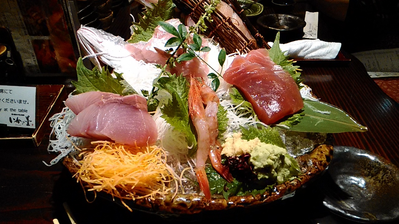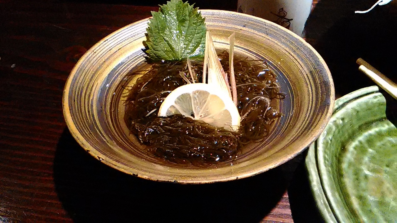 メニューを見ると思っていたより少し値段が高めでしたが、取りあえず刺身5点盛りと佐渡産もずく酢に熱燗を注文。