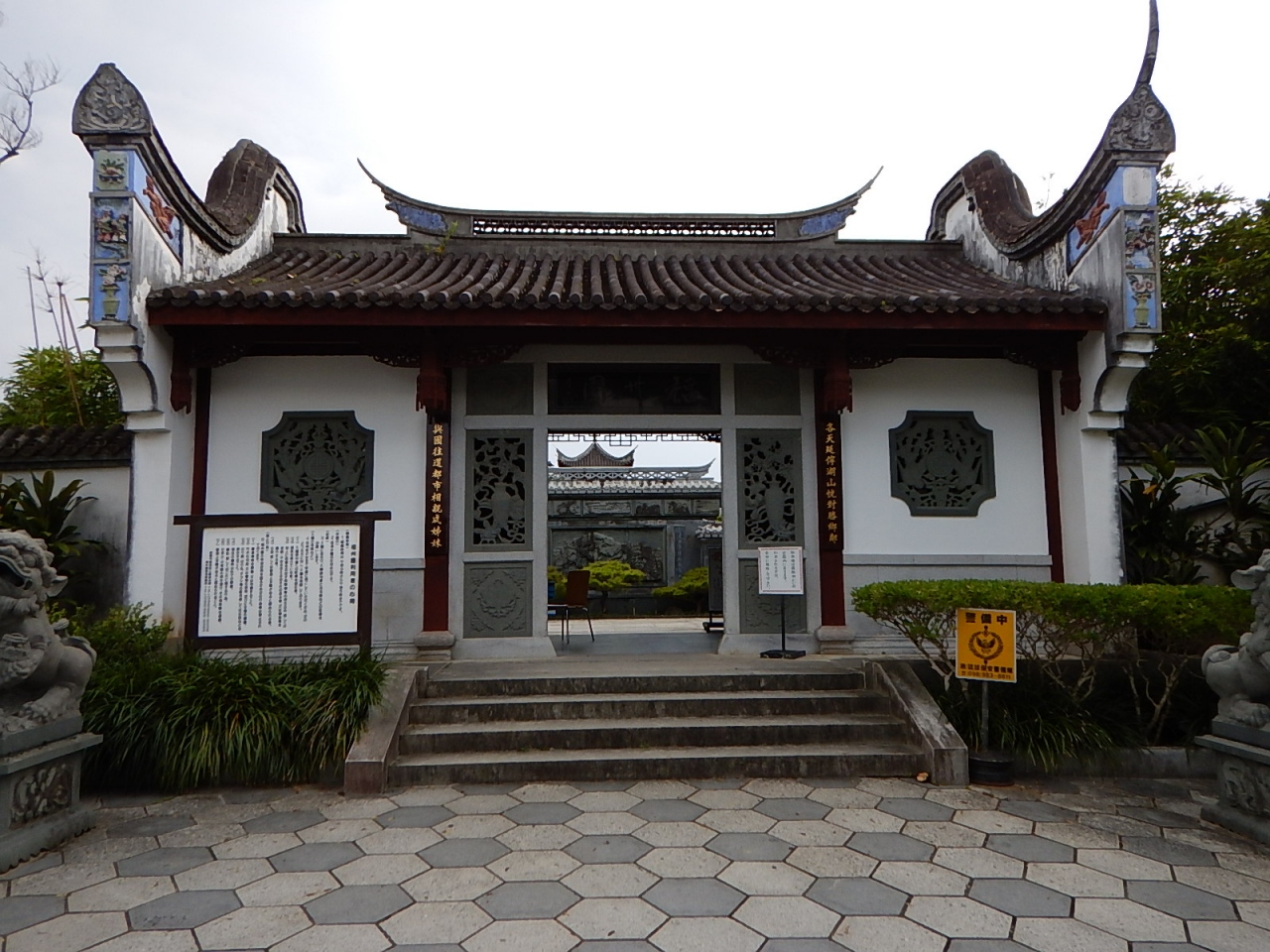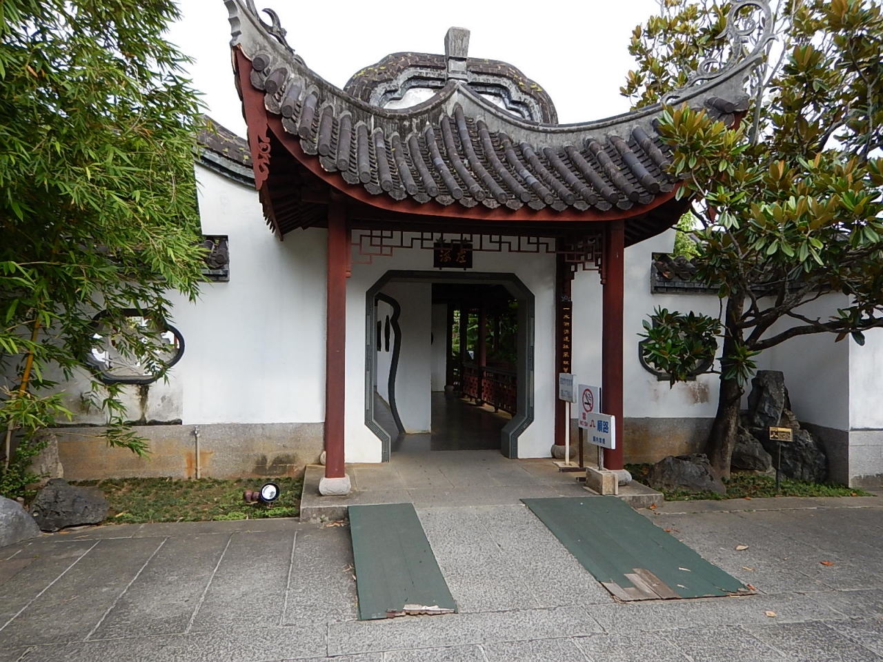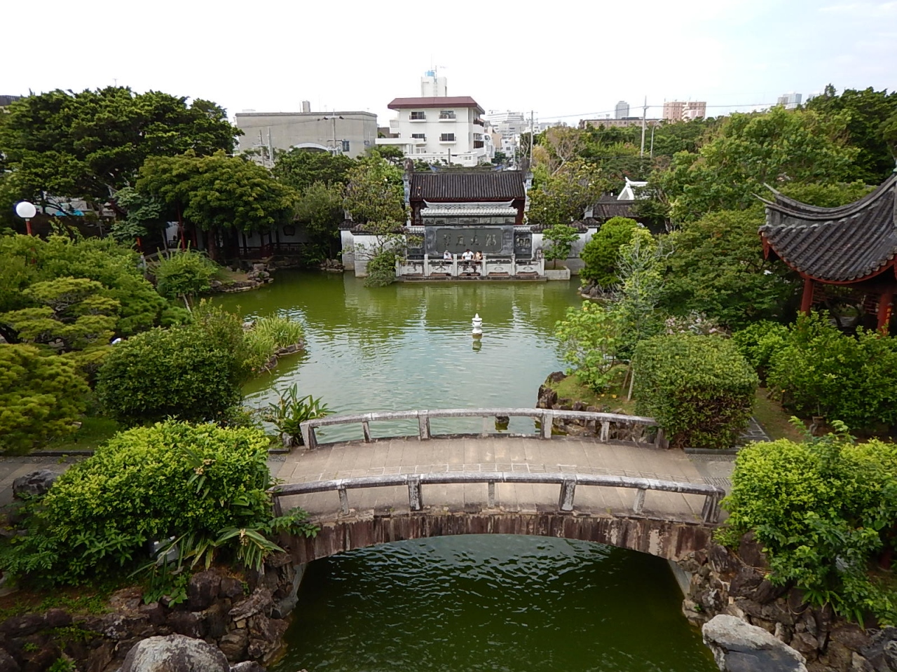 ガジュマルやシュロのような沖縄の草木が生い茂るが、あくまで建物は中国様式。