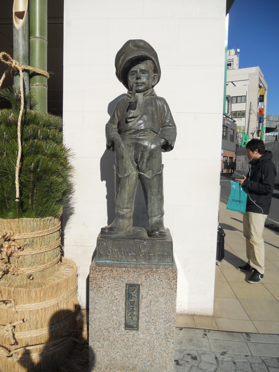 横浜駅西口にある「モアーズ」の正面入り口前に建っている少年の像です。