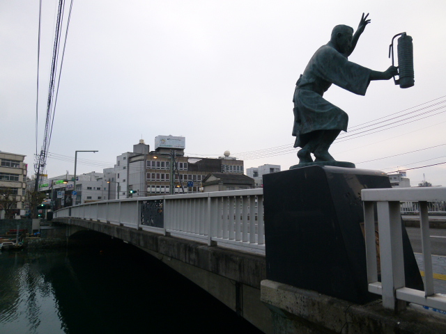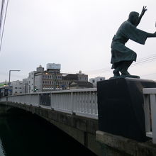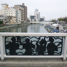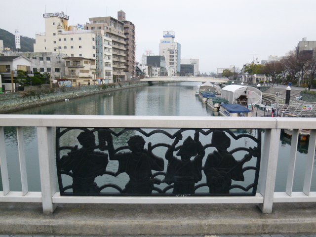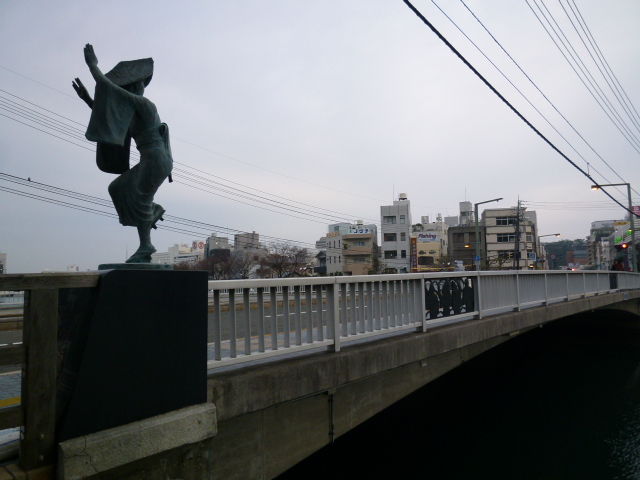 新町川の繁華街付近には新町橋、ふれあい橋、両国橋の三つ橋がありますがそれぞれ個性があります。道路は片側一車線で横に歩道がありますが、ここには男性と女性の阿波おどりを踊る姿を描いた像が建っています。徳島の雰囲気を表現しています。またこの橋から隣のふれあい橋までは新町川水際公園がありますがそこにはきれいな草花が植えられた花壇が並んでいます。散歩コースとしても最適です。