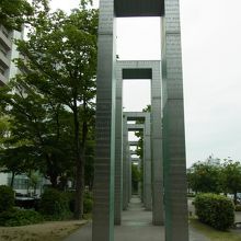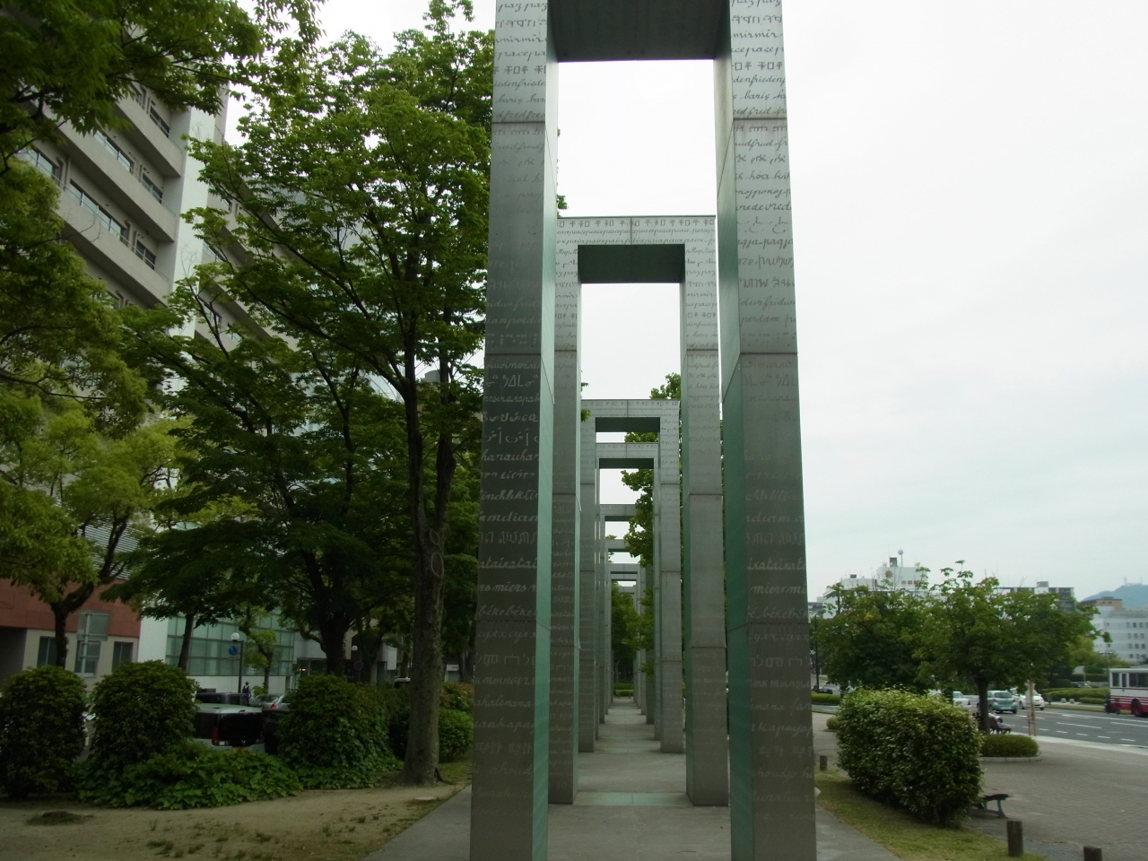 高さ9m、幅2.6m、奥行き1.6mのガラス製10基の門が、東西75mにわたって、平和大通り北側にある平和記念資料館(本館)の柱と平行に立ち並んでいるらしく、足元の敷石は、18種類の文字と49の言語で「平和」の文字が刻まれているとのこと。もっともと「平和の壁」プロジェクトは、世界平和を祈念し、世界の主要な言語で「平和」を書いた壁を世界の都市に設置、寄贈する事業で、広島市への寄贈もこのプロジェクトの一環でしたが、形が「門」であることから、「平和の門」と名付けられました。