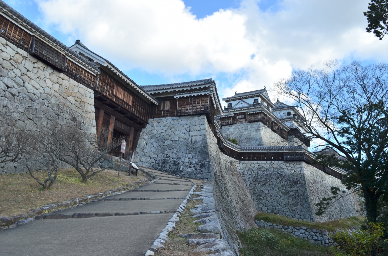最近のTVやマスコミで松山城がよく取り上げられている。丁度訪問時も、假屋崎省吾の生け花展が城全体でいけているのを見ることが出来た。ロープウエイとリフトで登るが健脚名人は歩いて登っている。城山8合目までで、あとは歩いての散策となる。約4百年前に