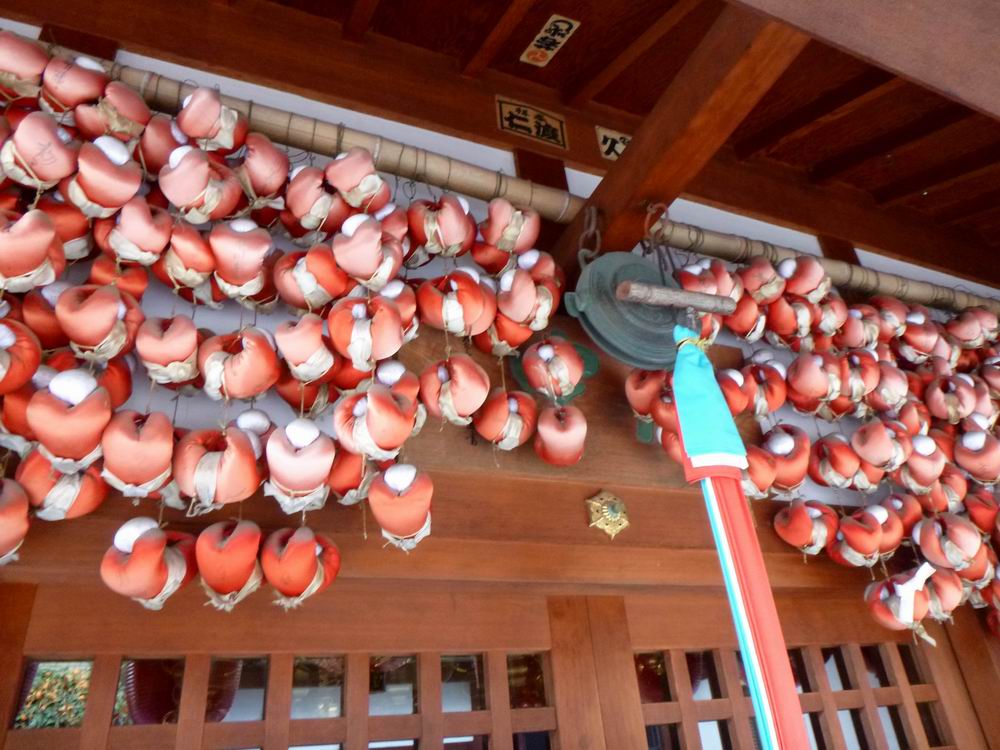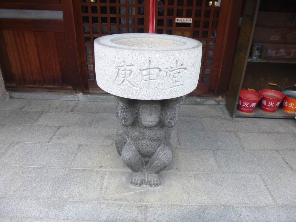 青面金剛の使いとされる猿の姿が随所に見られ、屋根の上にも猿、お堂の前には石を持ち上げる猿、お堂の軒下には魔除けの身代わり猿が大量につるされています。