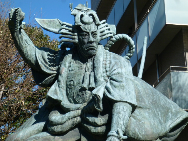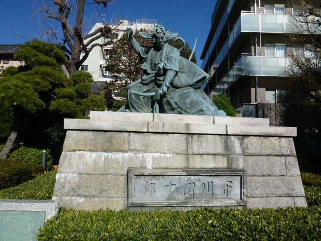 都内最古の寺院で知られ国内外からの参拝客が多い「浅草寺」があります。境内にはたくさんの碑や名所が残されていて、本堂裏側へ進むと「九代目市川団十郎の十八番の「暫像(しばらくのぞう)」が設置されています。この銅像が最初に作られたのが1919年、その後、第二次世界大戦中、政府の要請により金属回収されてしまいました。しかし十二代目市川団十郎襲名を機に復元されました。見事な睨みをきかせた表情豊かな銅像は舞台で生き生きと演じられているお姿そのものです。これは市川家一門(成田屋)の役者だけに伝わる邪気払いの所作ですので、是非ご覧ください。