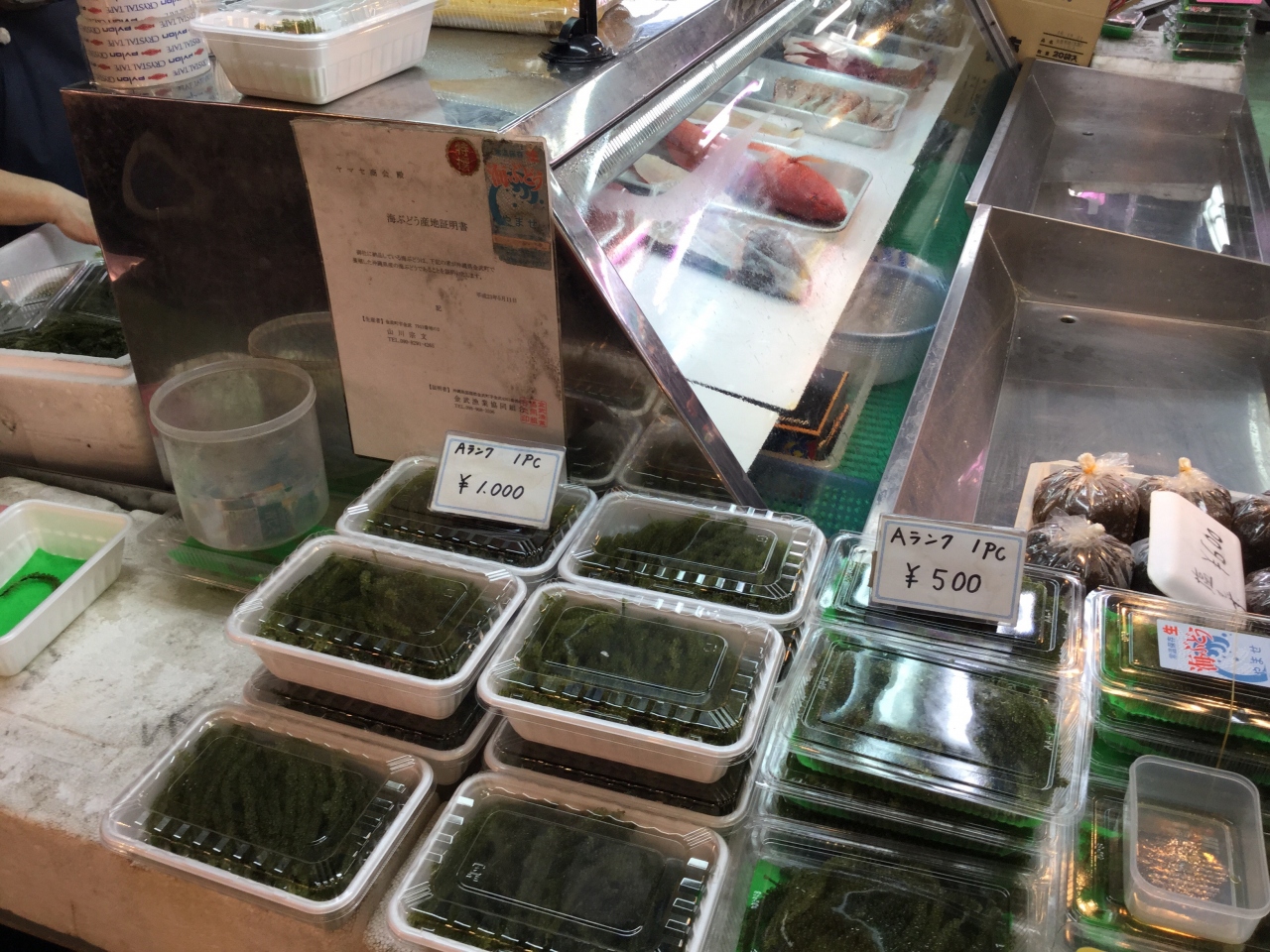 会社の先輩から海ぶどうのリクエストがあり、前日飲んだ時の沖縄のスタッフに聞いても、「それなら公設市場でしょう!」と。平和通りや市場本通りの商店街でも売っていますが、オススメは場内、と言っていました。