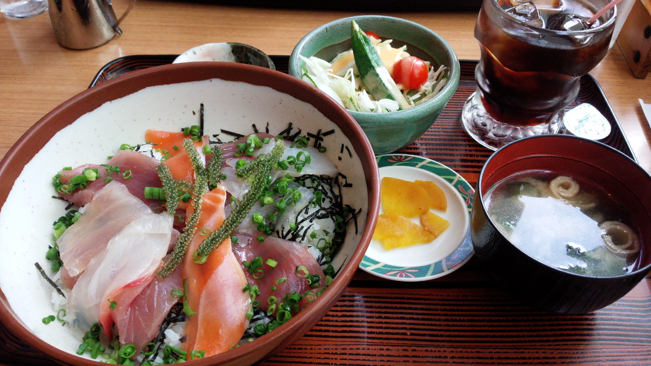 ランチは海鮮丼を注文しましたが、サラダにアイスコーヒーまで付いてました。