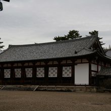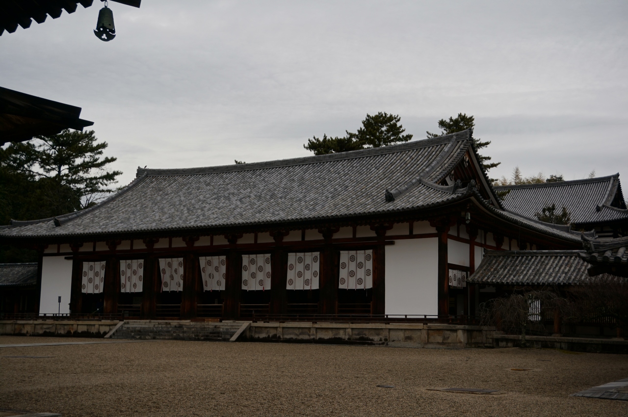 西院の五重塔と金堂の間を奥に進むと、大講堂があります。僧侶が学問を修める修行の場として造られました。中には、薬師如来像安置されています。両脇には、日光菩薩・月光菩薩があります。薬師如来様は、病気を治す薬の入った壺を持っています。