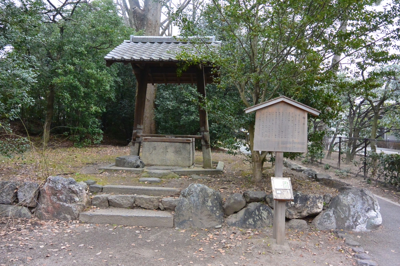 京都御所にはたくさんの井戸があったようで、今も井戸跡がいくつも残っていますが、これもそのうちのひとつです。京都御苑の北西部、旧一条邸内にあり、宮内庁の京都御苑事務所の裏側の辺りにありますが、現在井戸は枯れているそうです。