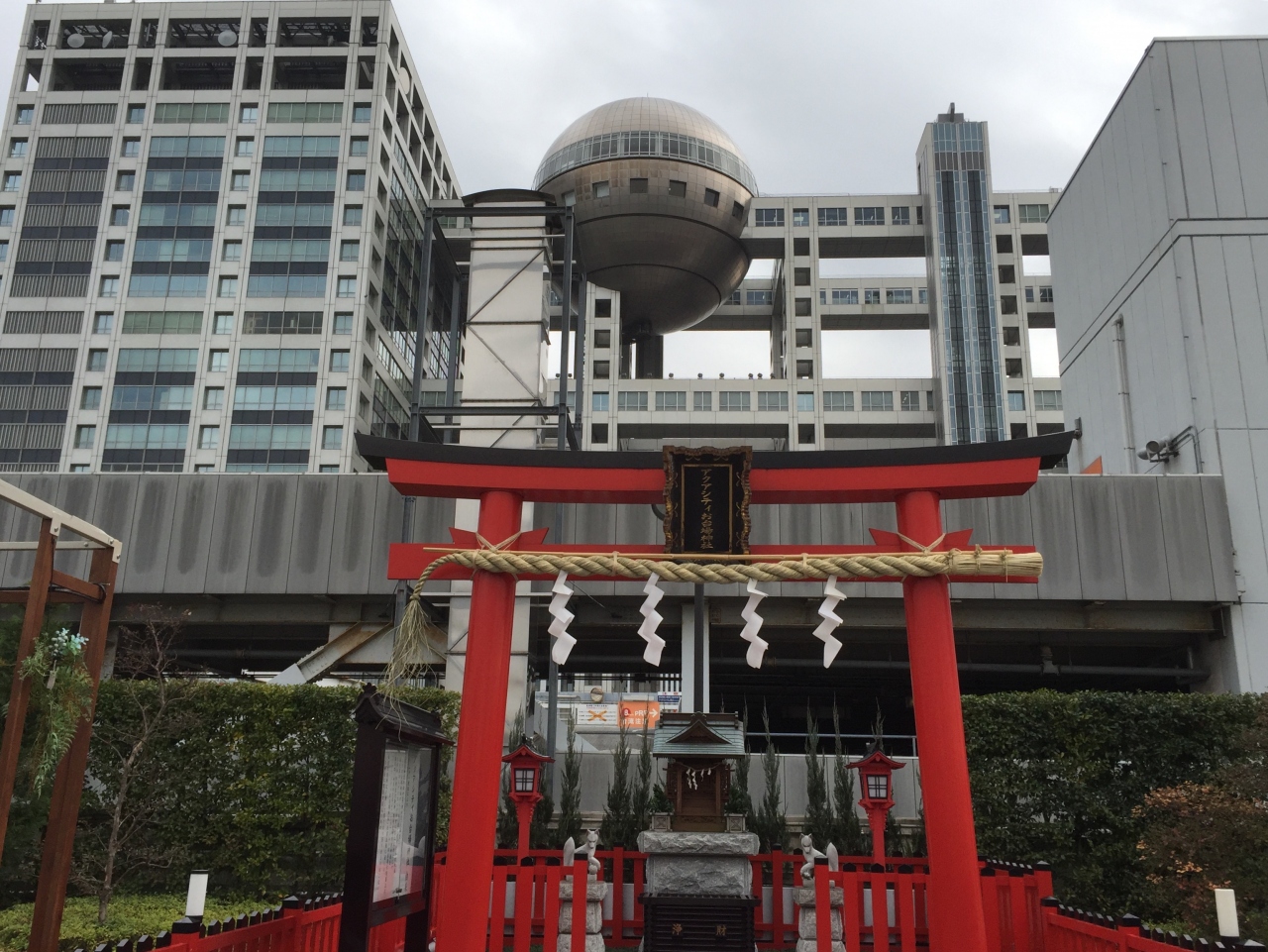 眼前にフジテレビ、背後にレインボーブリッジも拝めるお台場神社