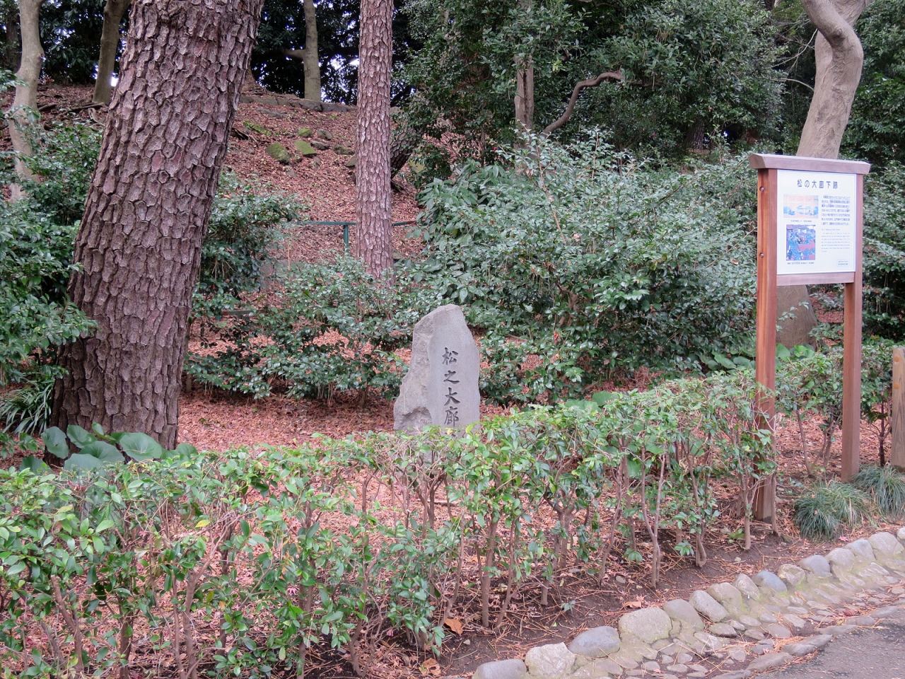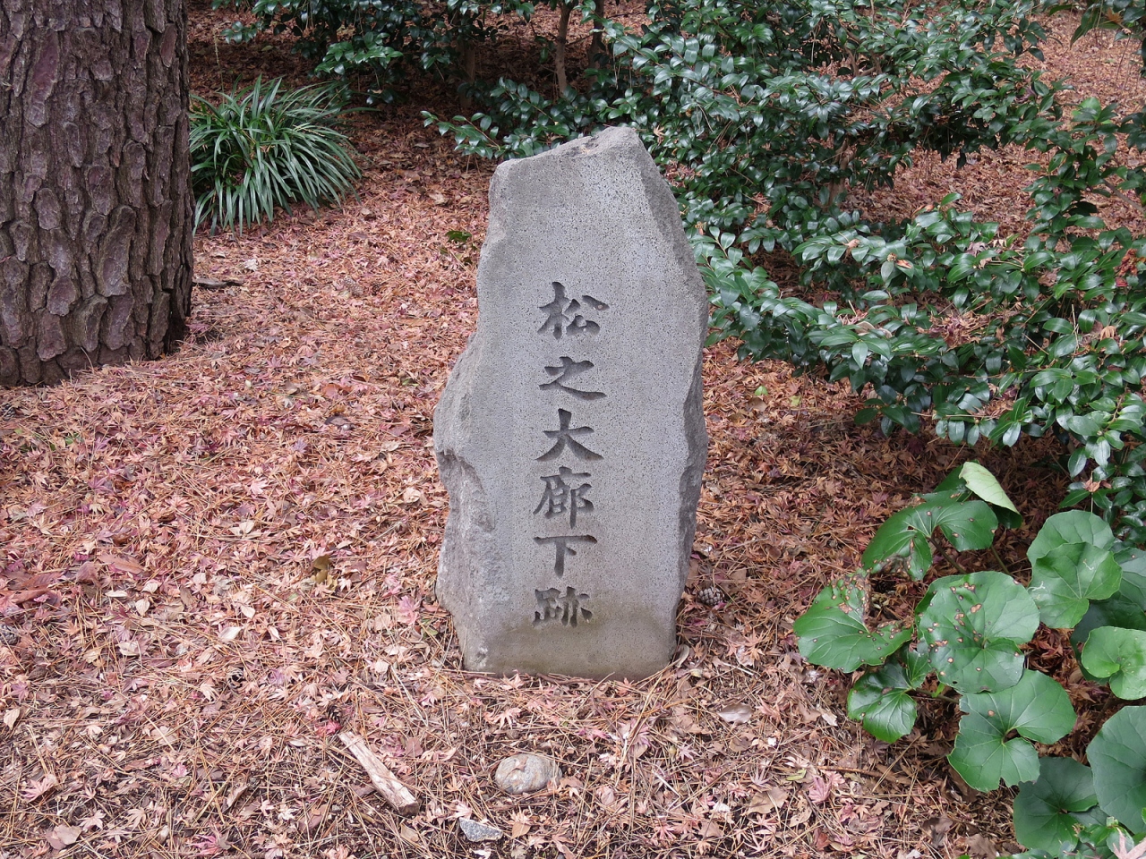 皇居東御苑内には「松之大廊下」を示す碑が建てられています。「松之大廊下」といえば、ちょっと古めの日本人であれば、誰もが赤穂事件を思い出す、そんな場所です。もちろん実際の廊下は50メートルほどもあったということですから、この碑が建てられている場所が何を示しているのかは分かりません。刃傷事件が起こった場所辺りだと想像して見るのが良いでしょうね。