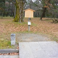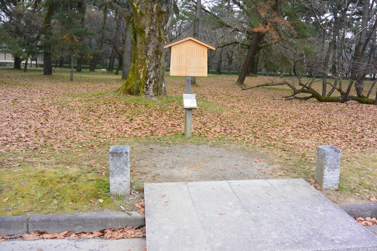 京都御所の東側に立て札があります。砂利道より一段高くなったところに立て札が立っていますが、そこへ上がるための石の板が渡してあるので場所はすぐわかります。ただし、説明板があるだけで遺構は全く残っていません。