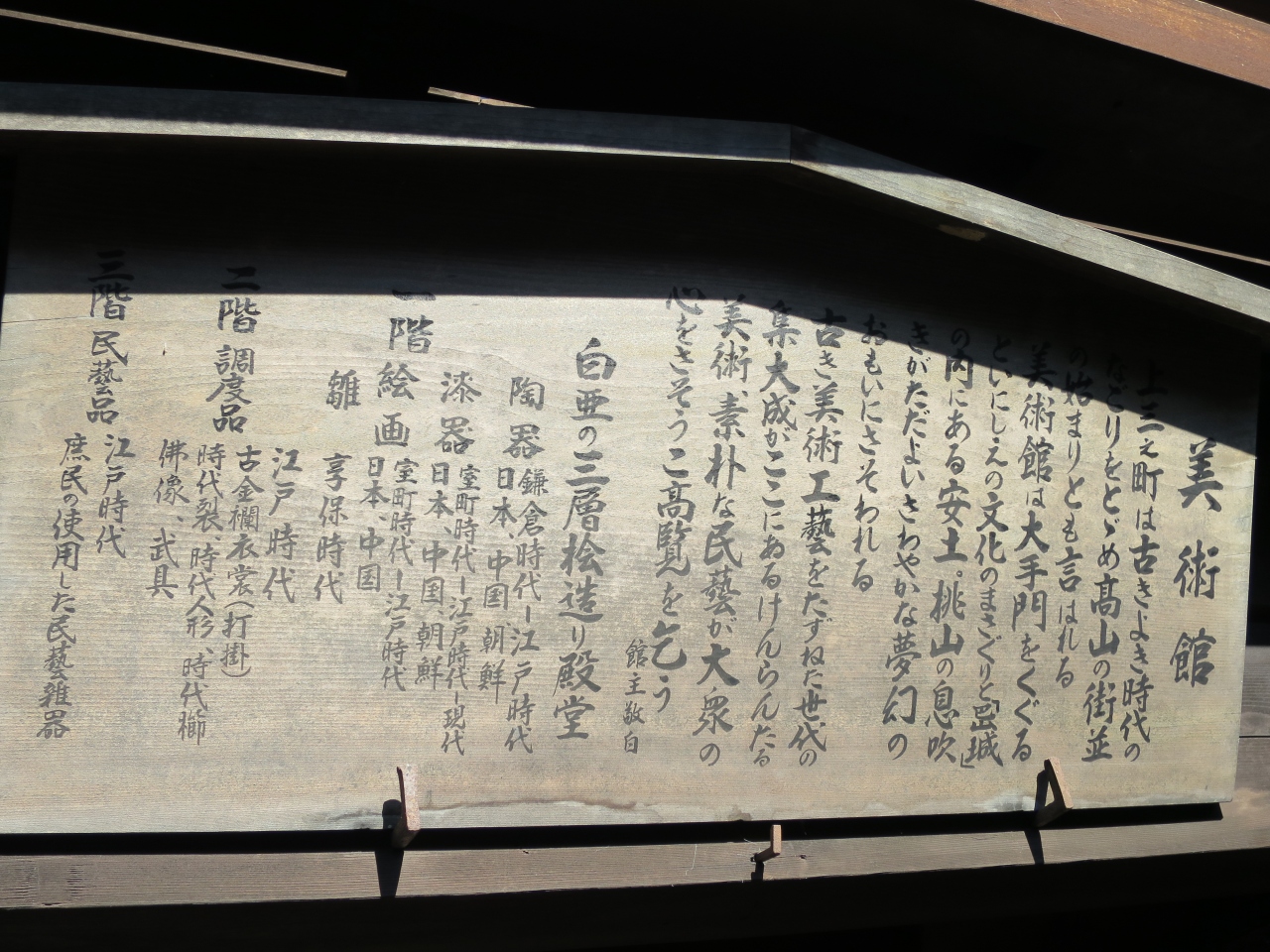 飛騨高山三之町の古い町並みの中に高山城二の丸の登城門をもとに造られた変わった門が藤井美術民芸館の目印です。藤井糺一氏が個人的に収集した古伊万里、古九谷、大観の掛け軸などの古美術品、民芸品を展示する美術館ですが、展示内容に対して700円の入場料はちょっと高い。
