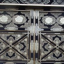 なんといってもその細工が見事、豪華です。黒漆でできているらしく、近づいてよくよく見てみると細かい部分に見ごたえがありました。