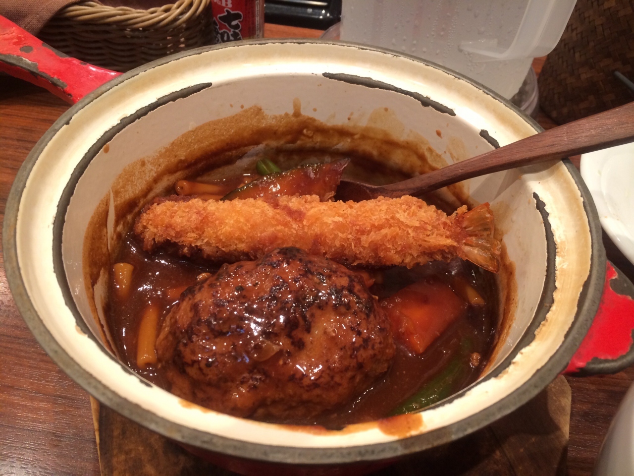 煮込みハンバーグと、クーポンで海老フライもセットになってます。