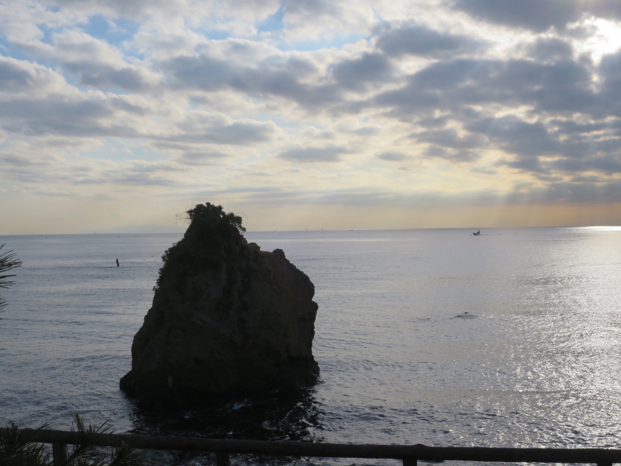 岩場の多い三浦半島の南西部。荒々しい三浦半島の風景を眺めるには国道を外れて狭い行き止まりの道を進むなど面倒なことが多いのですが、立石に限っては国道のすぐそばの海から突き出ており、最寄りの駐車場に車を停めて見学が可能です。夕刻時がシルエットになって美しい場所です。